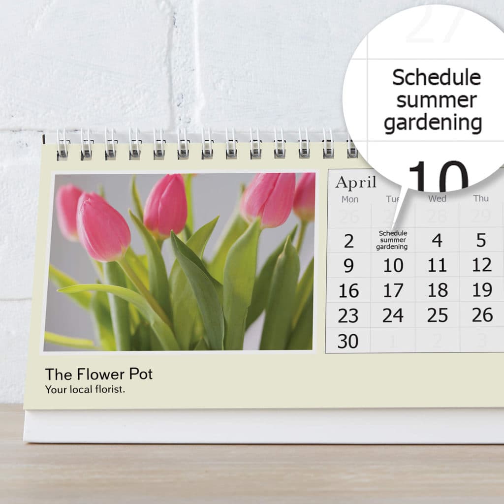 - Give out custom calendars. Great for Christmas, you can highlight your best work in photos and add seasonal reminders like “Schedule summer gardening.”