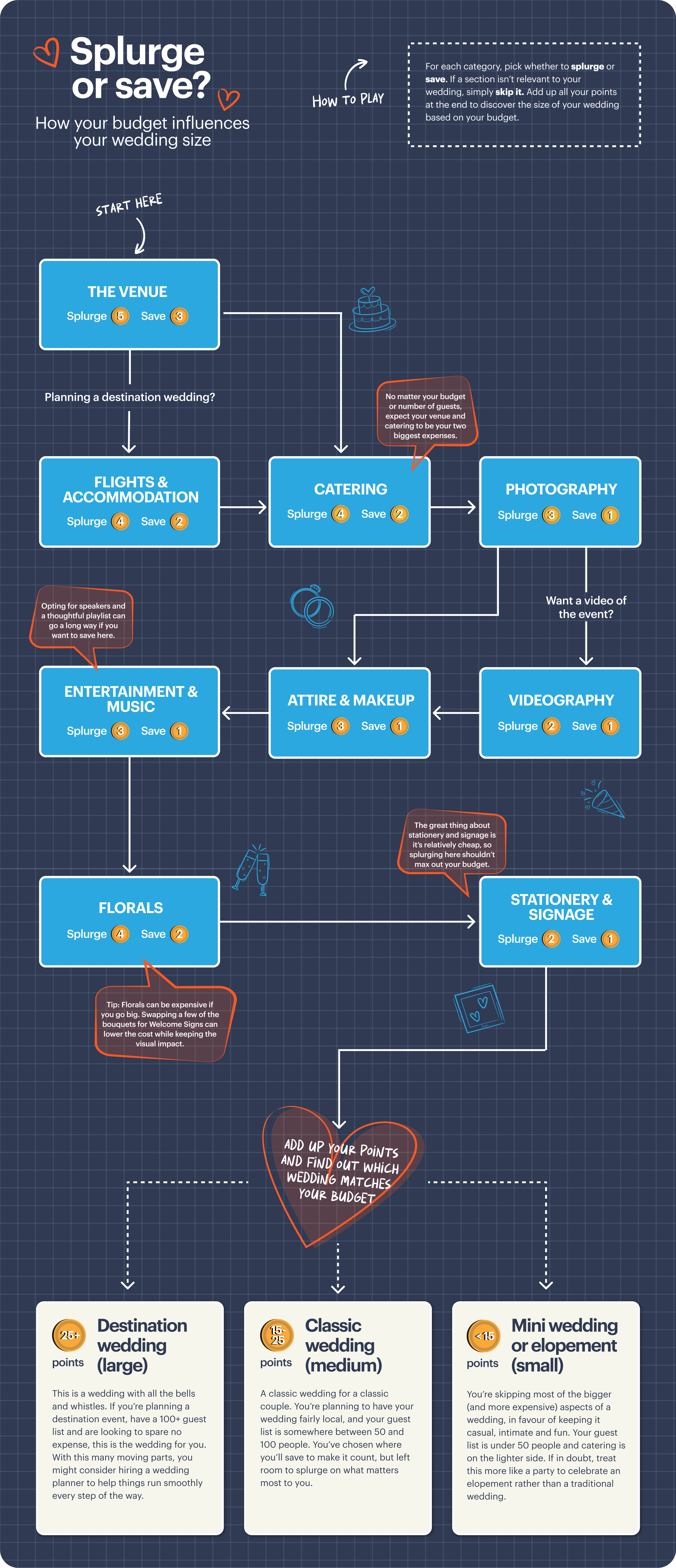 Guest count, venue type and location can alter these wedding cost percentages significantly. A smaller guest list may allow more flexibility in your wedding budget for stationery, decorations or photography. Use the wedding cost breakdown as a starting point, then customise it to fit your plans.