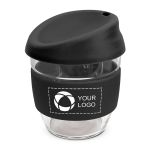 - Elegant 250ml reusable borosilicate glass coffee cup with a secure push on silicone lid