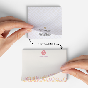 Our printable sticky notes are available in 2 different sizes. Each notepad contains 50 sheets of 80 gsm printed white paper. Plus, they are recyclable and come with a convenient self-adhesive backing (a feature that makes them easy to stick and use as quick references). We also offer a wide range of custom designs to choose from – whether you need to stock your team’s desks, add a little extra to your next gift or anything else.